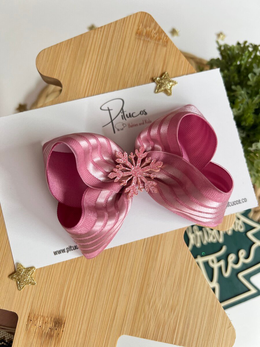 Lazo elaborado en cinta de rayas satinada color palo de rosa oscuro. Interno Palo de Rosa Oscuro. Aplique de copo de nieve