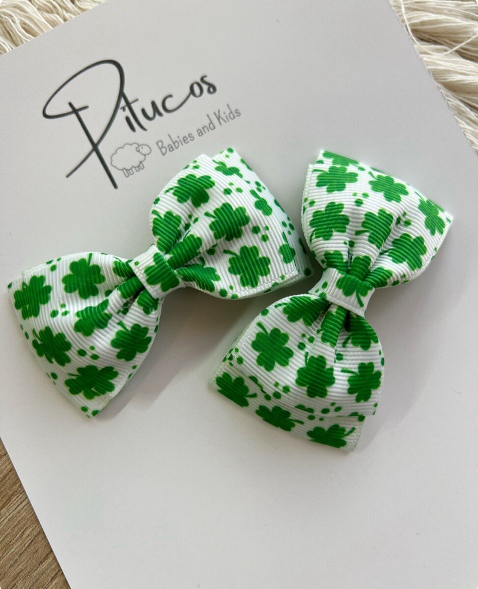Lazo elaborado en cinta blanca estampada con tréboles verdes.