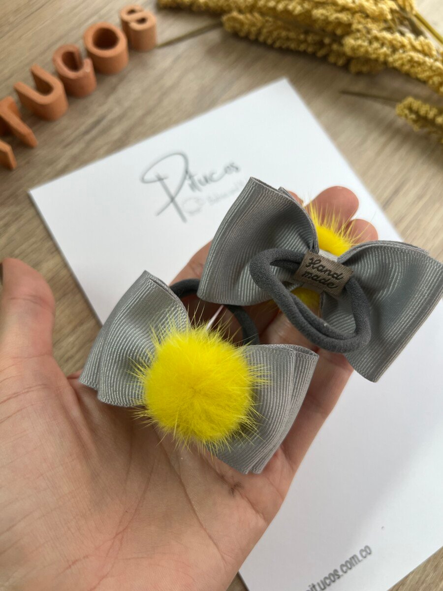 Lazo elaborado en cinta gris con pompón amarillo