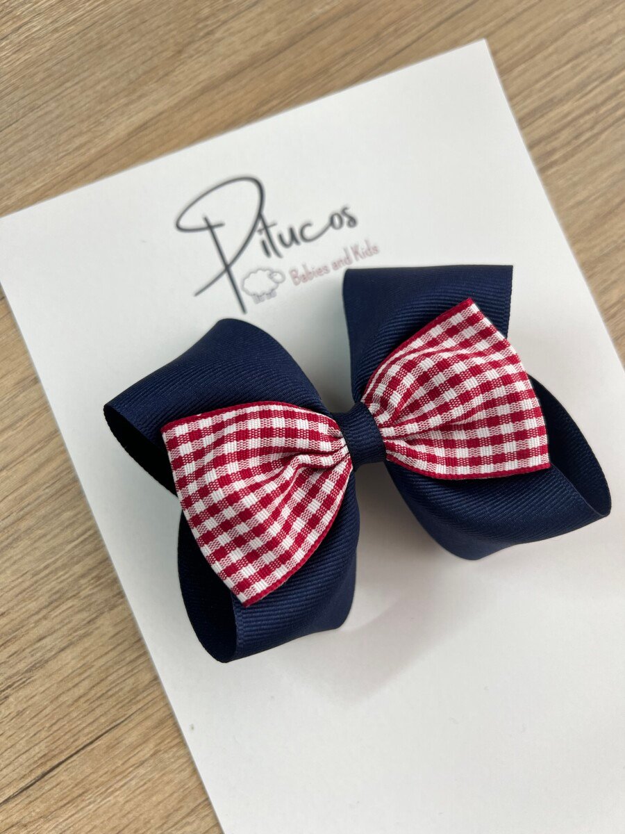 Lazo elaborado en cinta lisa azul oscuro con centro de cuadros rojo y blanco.