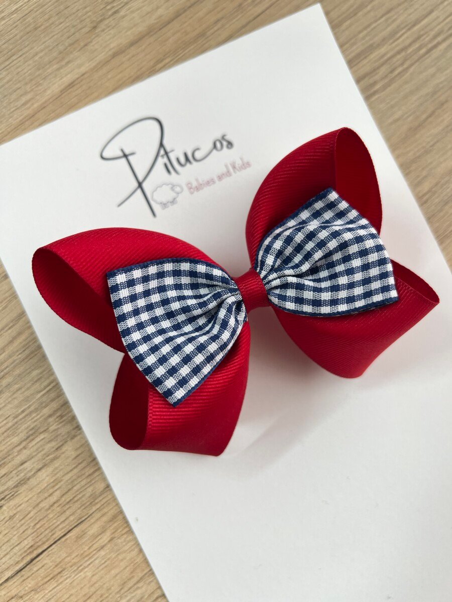 Lazo elaborado en cinta lisa roja con centro de cuadros azul oscuro y blanco.