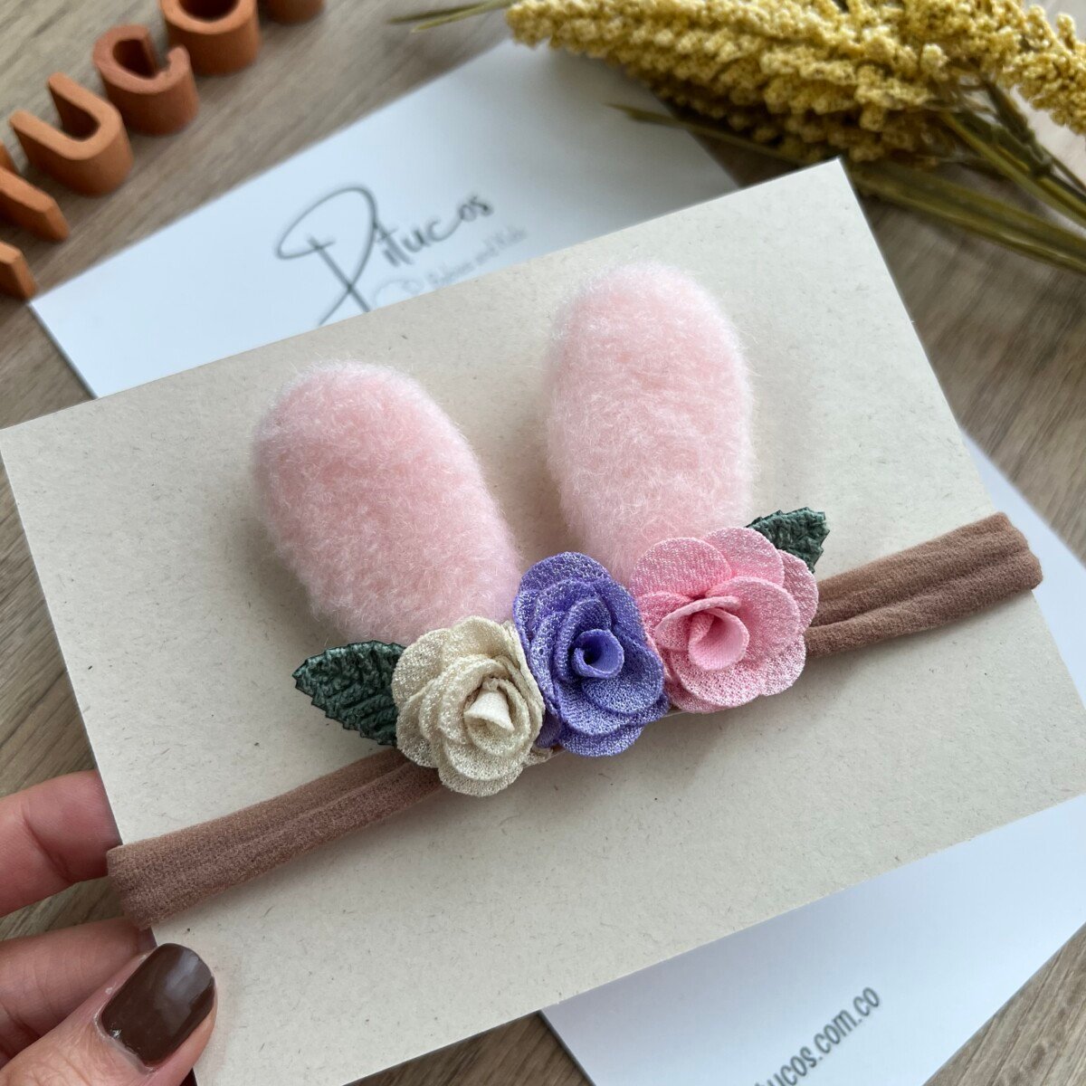 Aplique de orejas de conejo rosadas con flores. Tamaño aproximado del aplique 7 Cm.
