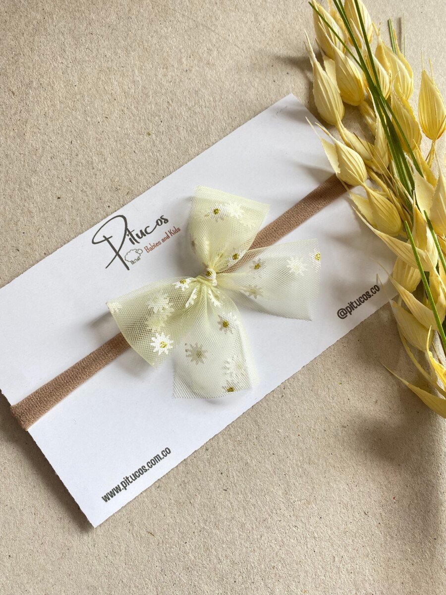 Balaca con lazo elaborado en tull amarillo claro con estampa de margaritas.