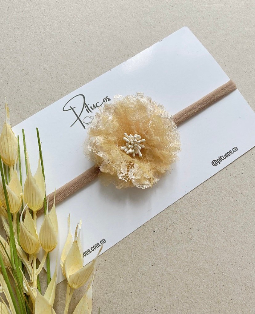 Balaca con aplique de Flor elaborada en tela y organza con centro de pistilos