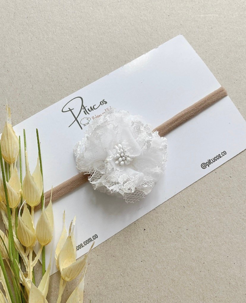 Balaca con aplique de Flor elaborada en tela y organza con centro de pistilos