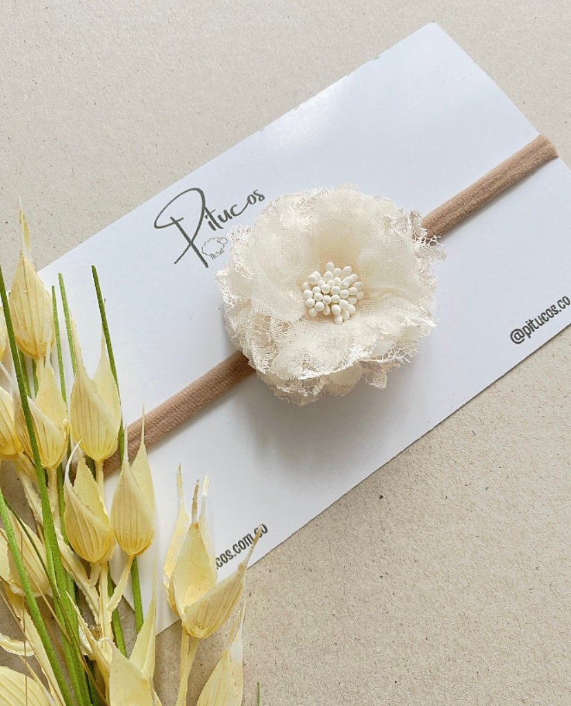 Balaca con aplique de Flor elaborada en tela y organza con centro de pistilos