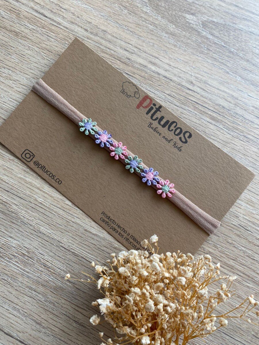 Balaca con aplique de 6 mini flores en tonos pastel.