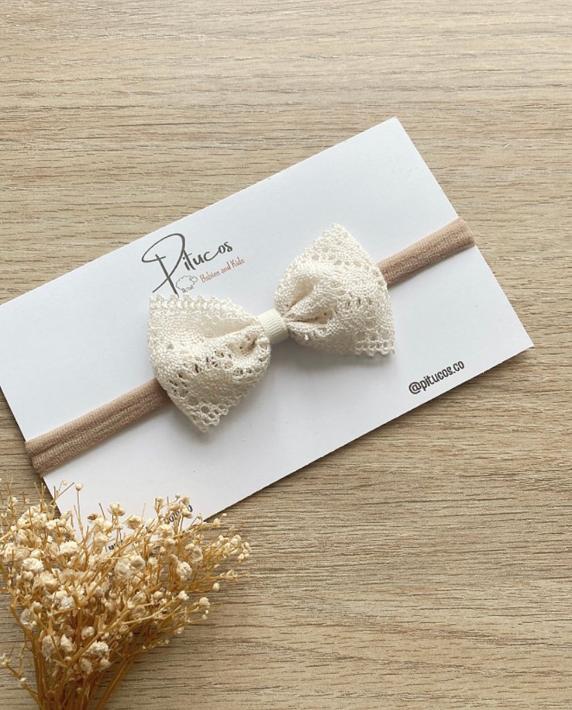 Balaca con moño elaborado en encaje color marfil. Tamaño aproximado del lazo 8 cm.