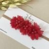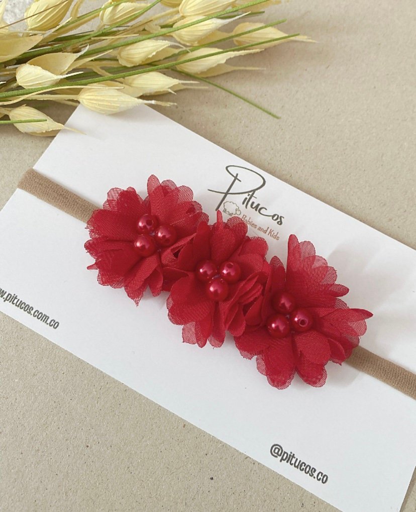 Balaca con aplique de 3 flores con centro perlado en el mismo tono de la flor.