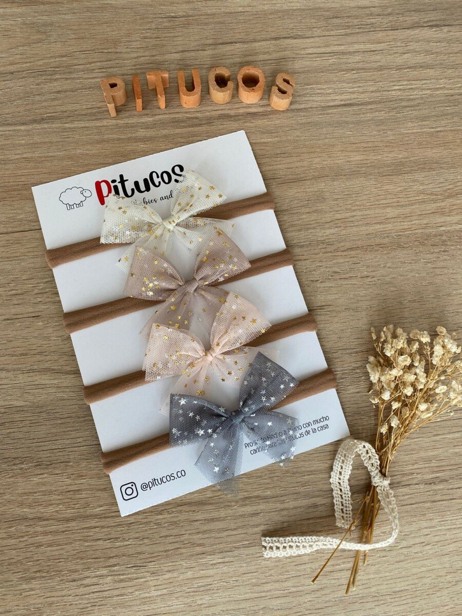 Balaca con moño elaborado en tull con estrellas doradas.