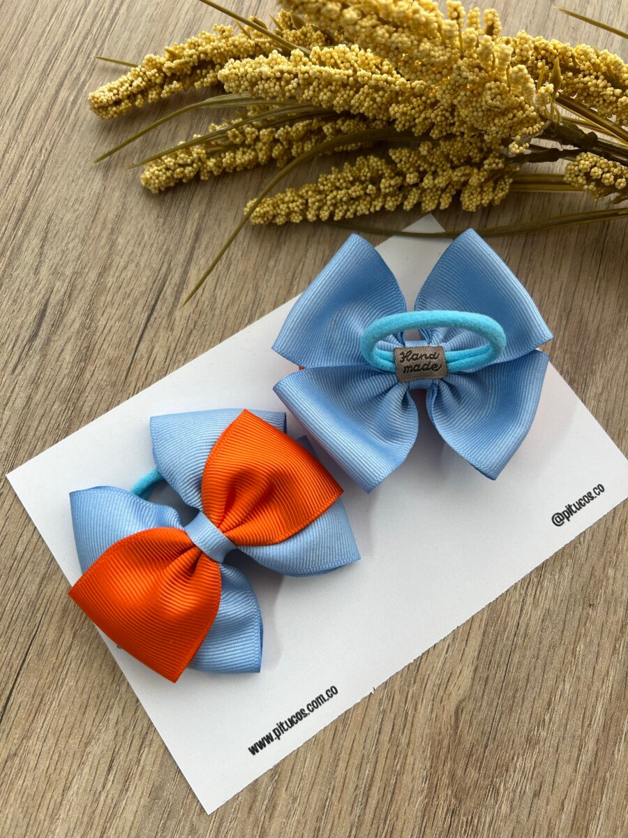 Lazo elaborado en cinta azul cielo y naranja vivo.