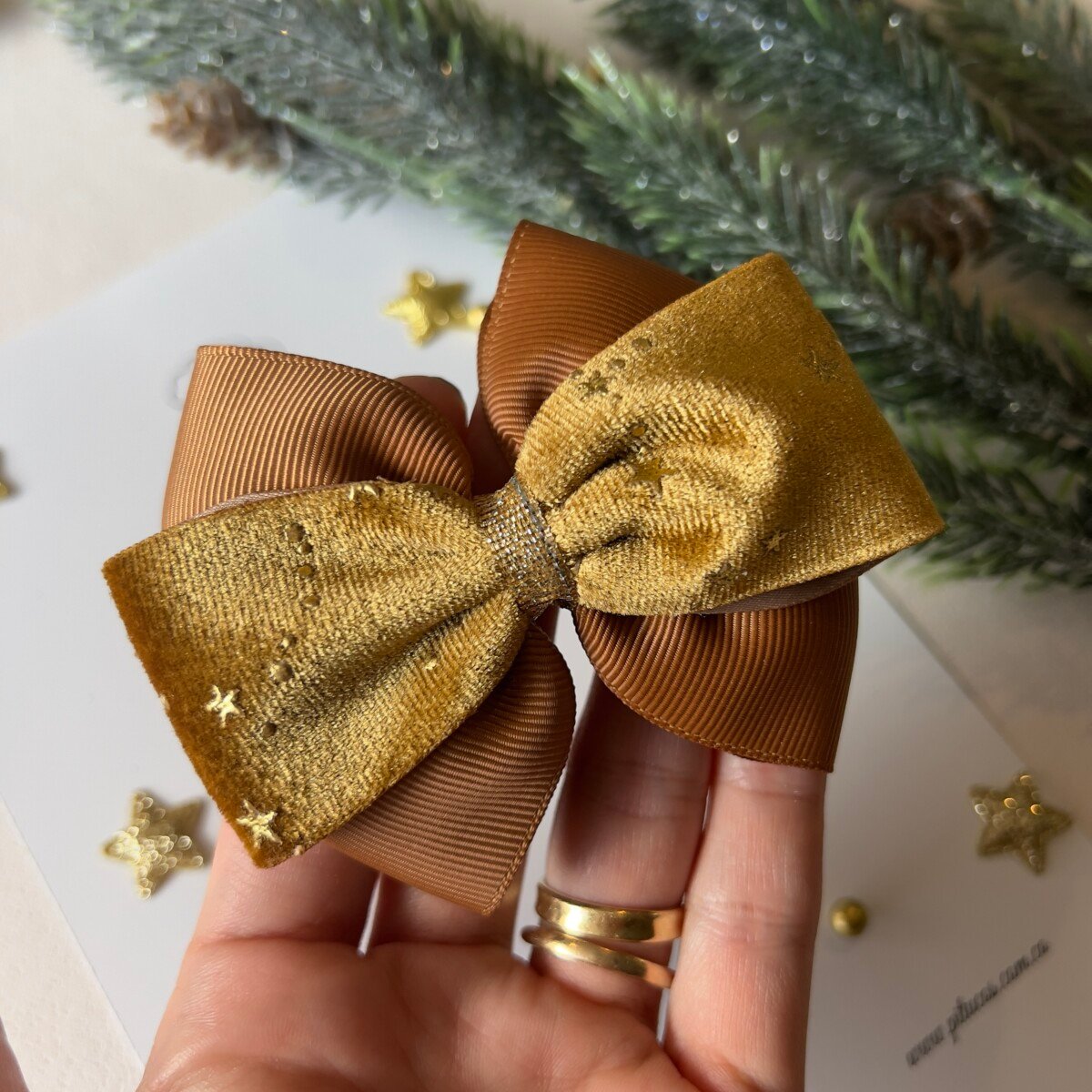 Lazo elaborado en cinta lisa color marrón dorado y cinta de terciopelo dorada con estrellas