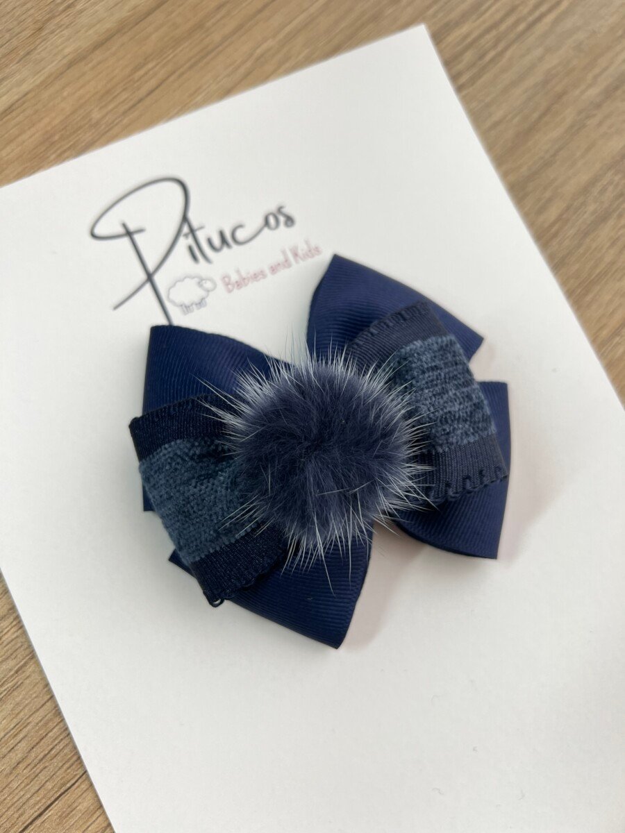 Lazo elaborado en cintas combinadas azul oscuro y centro de Pompom Plush azul oscuro.