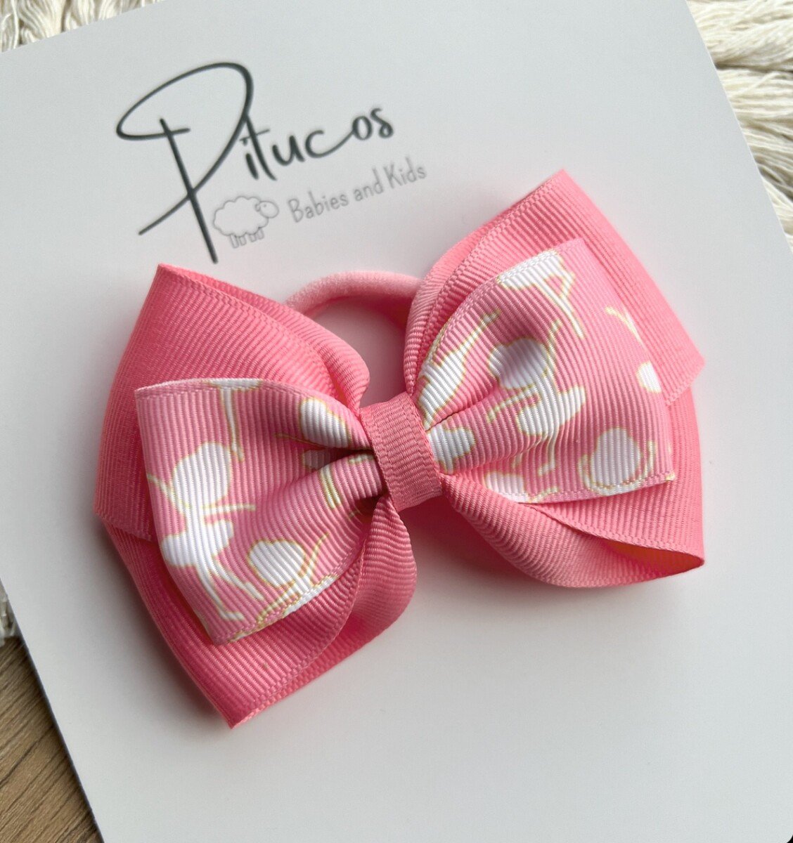 Lazo elaborado en doble cinta: rosa medio + estampada de bailarinas.
