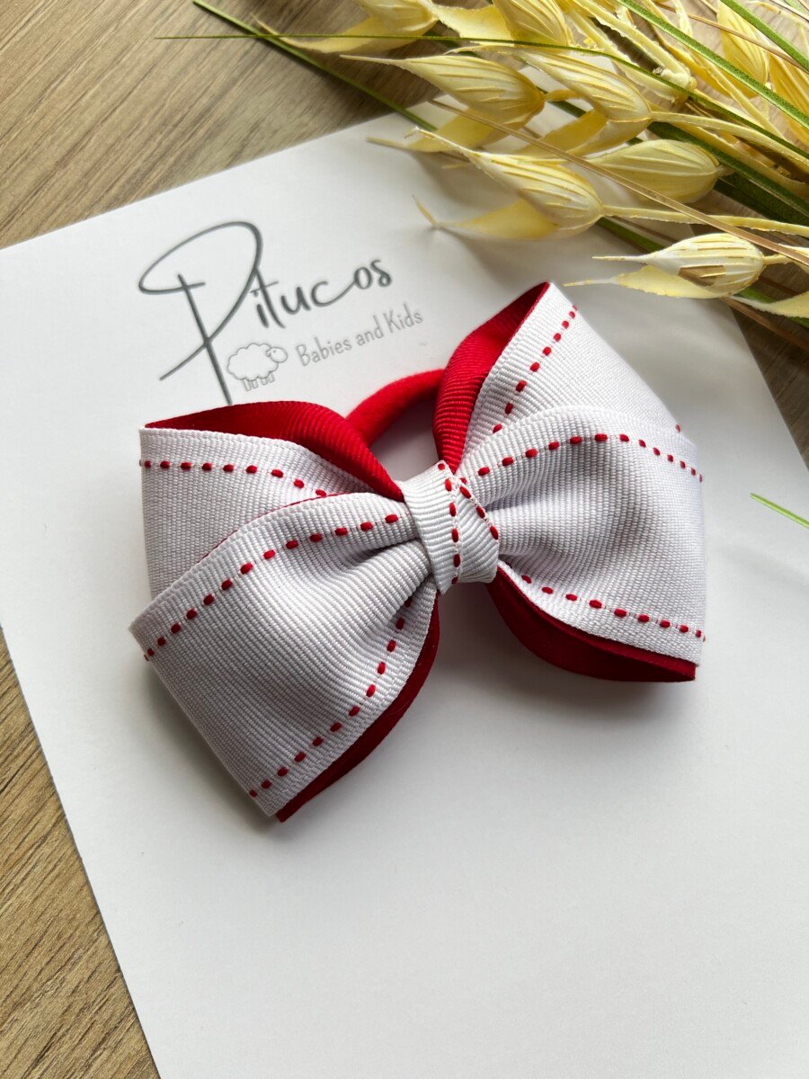 Lazo elaborado en cinta combinada: externo blanco con pespuntes rojos e interno rojo