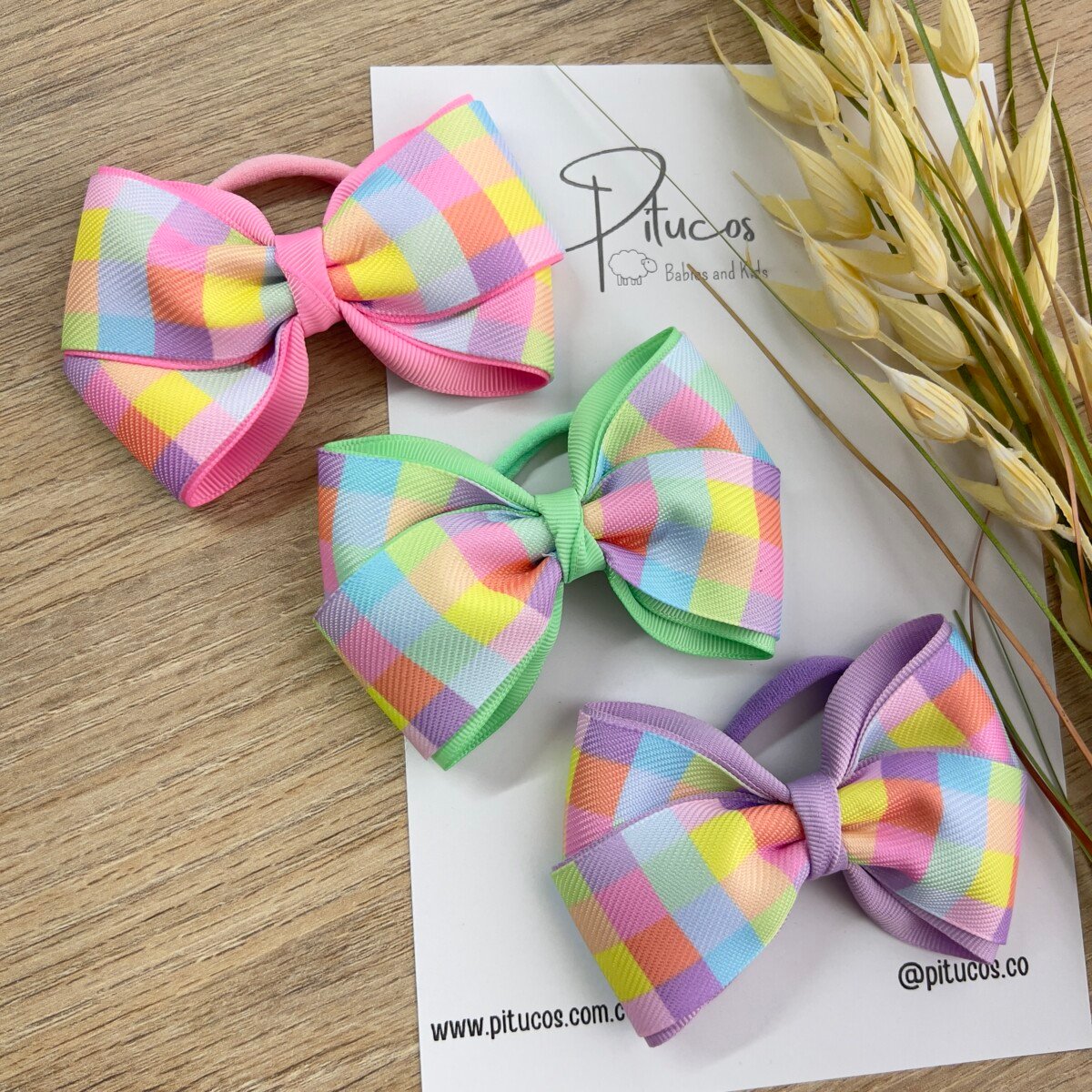 Lazo elaborado en doble cinta: una a cuadros en colores candy y otra (interna) unicolor.