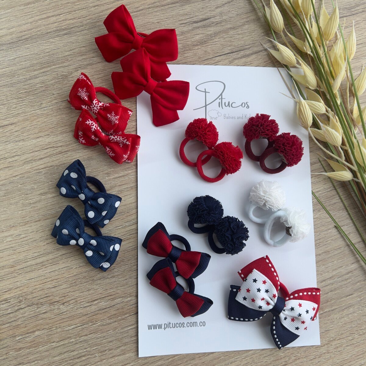 Kit listo con 17 mini colitas escolares en tonos rojo, azul oscuro y blanco.