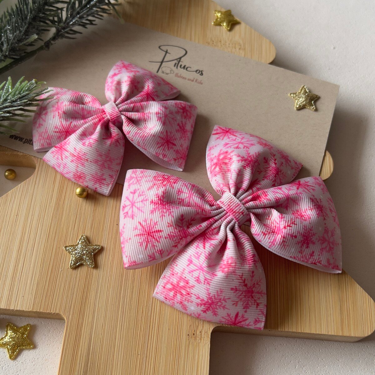 Lazo elaborado en cinta estampada para niña. Disponible en balaca suave de nylon o pinza metálica de 4,5 Cm completamente forrada con cinta.