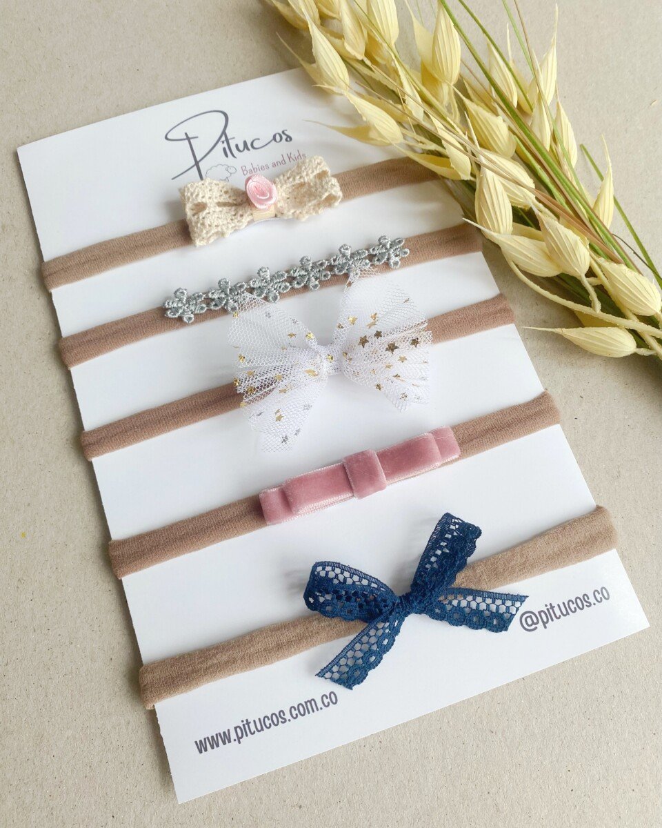 Kit de 5 balacas en colores básicos, ideales para recién nacida, por su tamaño pequeño y materiales leves y suaves.