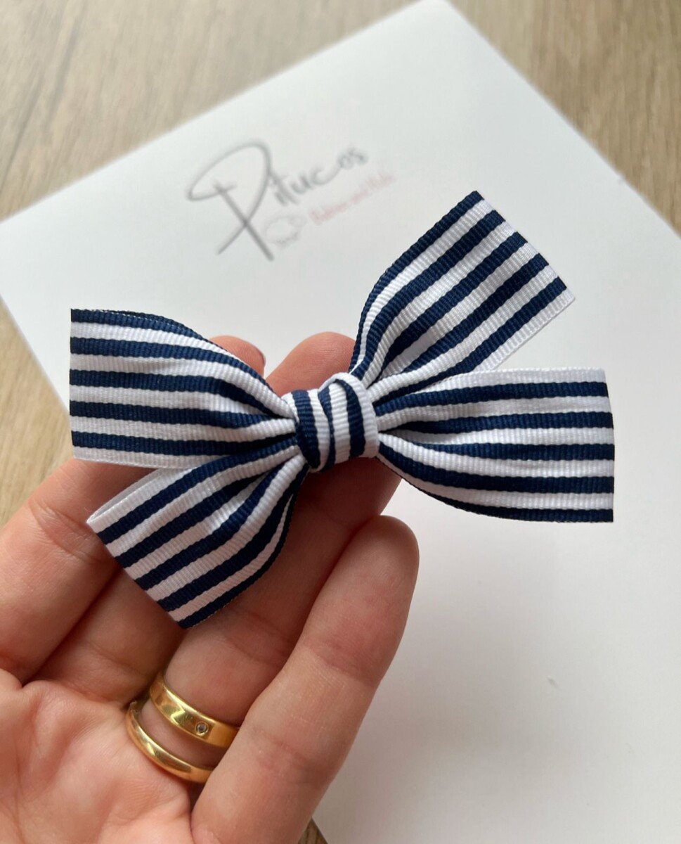 Lazo elaborado en cinta de rayas azul oscuro con blanco.