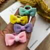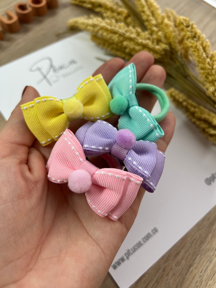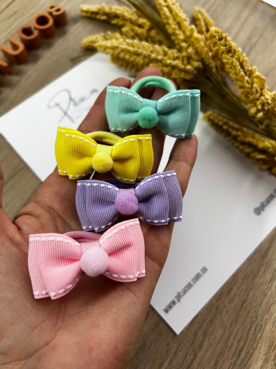 Mini Colitas con lazo elaborado en cinta pespunteada y Pompom en el centro.