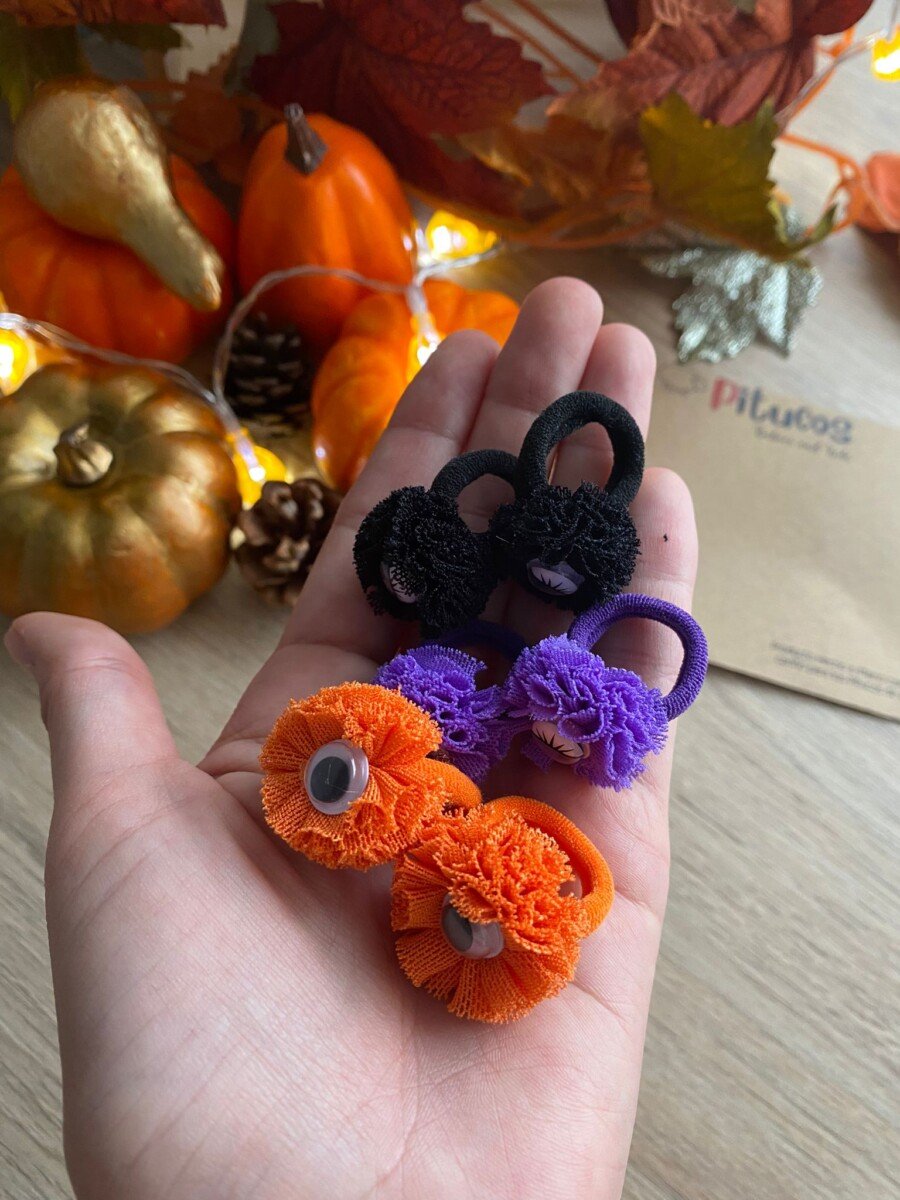 Par de mini colitas con aplique de pompom con ojito loco.