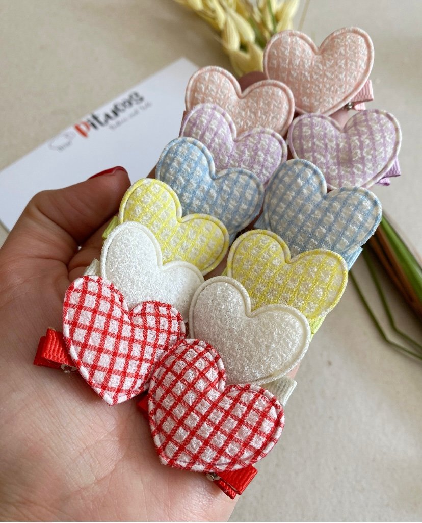 Pinzas de 3 cm completamente forradas en cinta con aplique en forma de corazón de cuadritos.