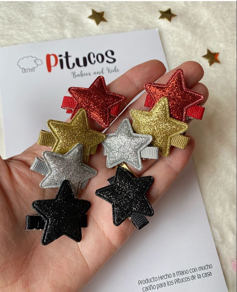 Mini pinza metálica de 3 cm completamente forrada en cinta y aplique de estrellita brillante.