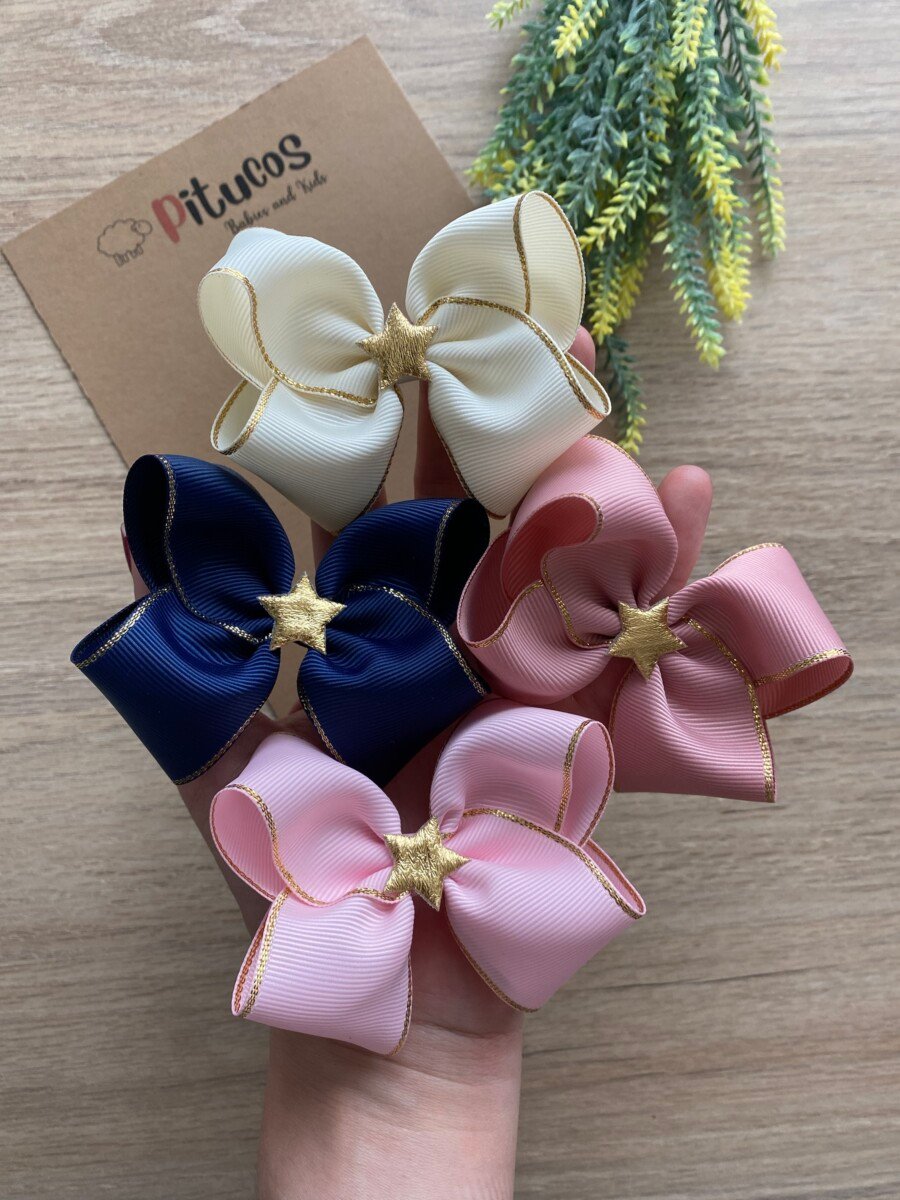 Moño elaborado en cinta con ligeros toques dorados y aplique de mini estrellita dorada en el centro.