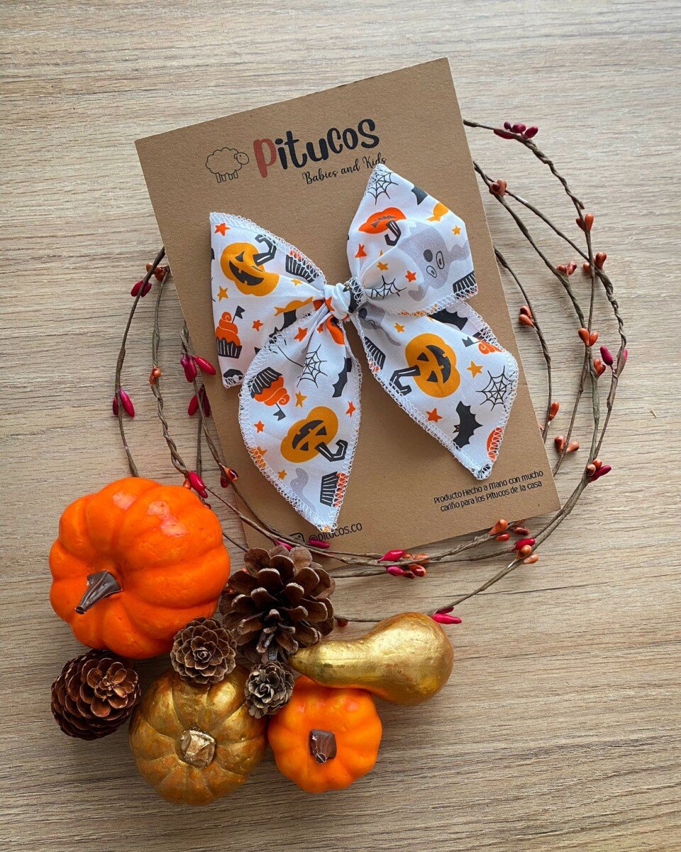 Moño elaborado en tela 100%  algodón con estampa de Halloween.