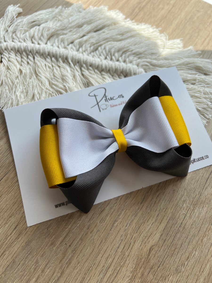 Lazo elaborado en cinta triple: gris oscuro, amarillo vivo y blanco.