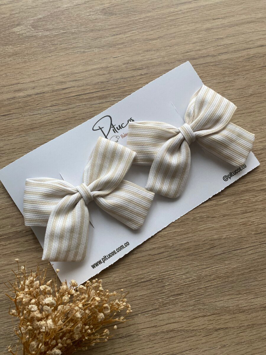 Moño elaborado en tela estampada de rayas beige con blanco. Tamaño aproximado 9 Cm.