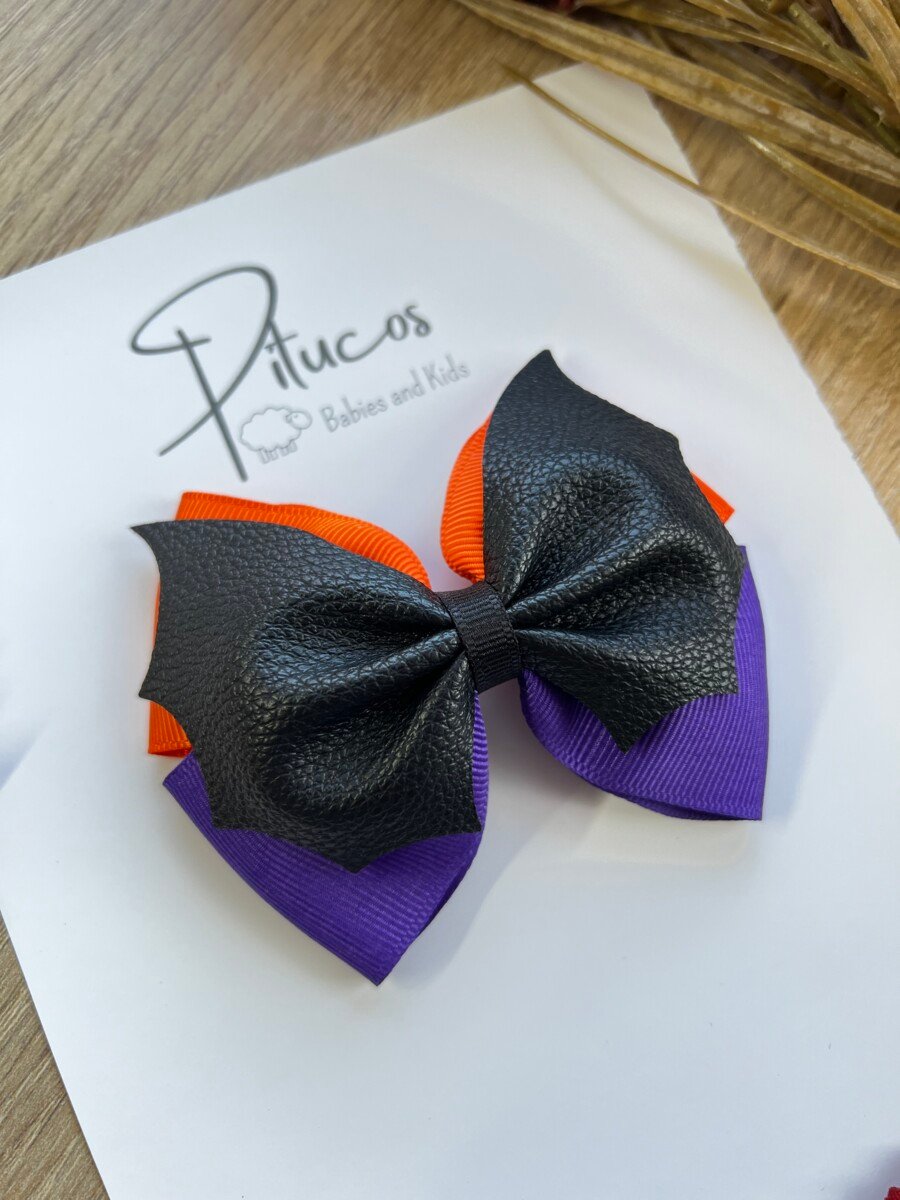 Lazo elaborado en cinta morada y naranja con aplique de alas de murciélago en cuerina negra.