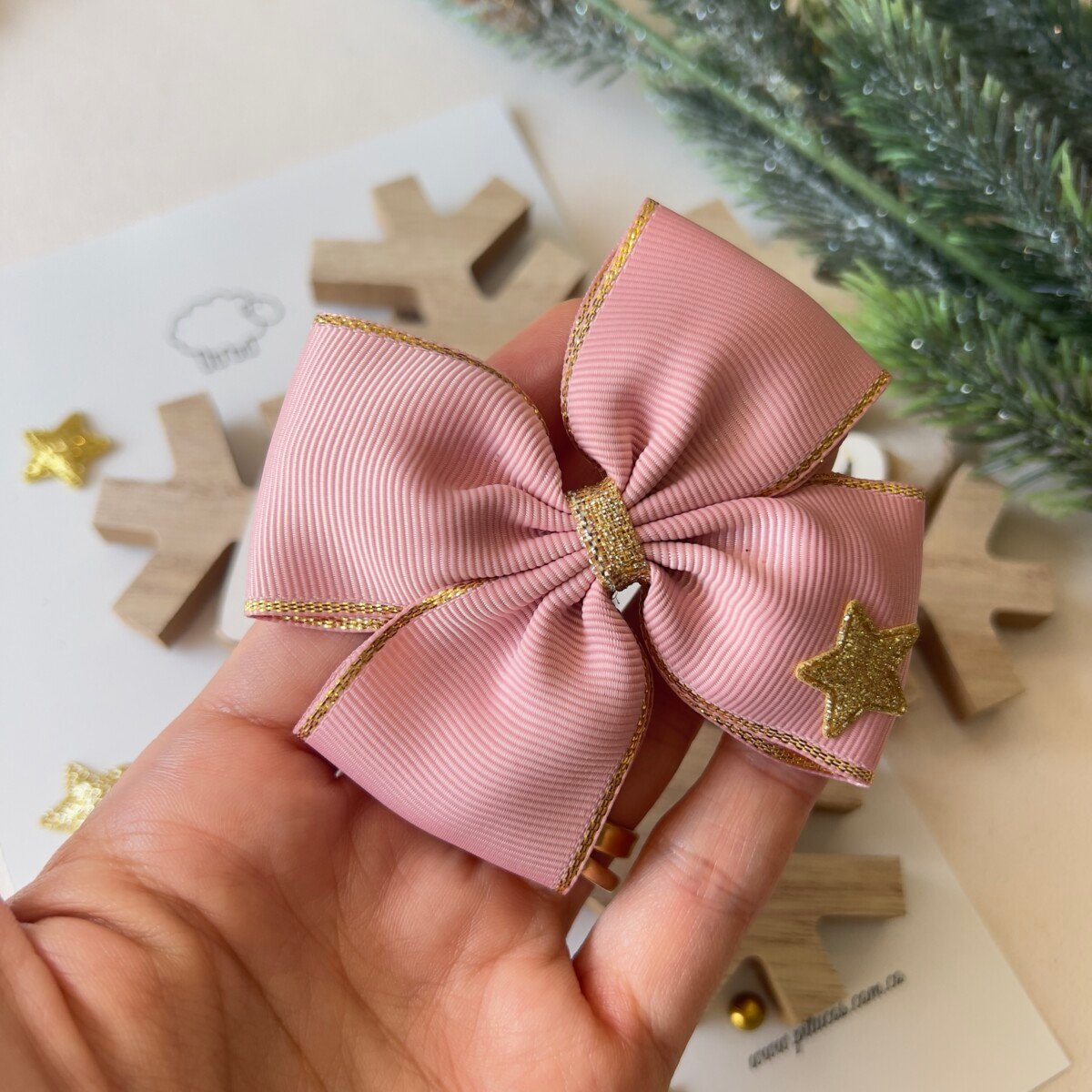 Lazo elaborado en cinta con borde dorado y aplique de estrella dorada.